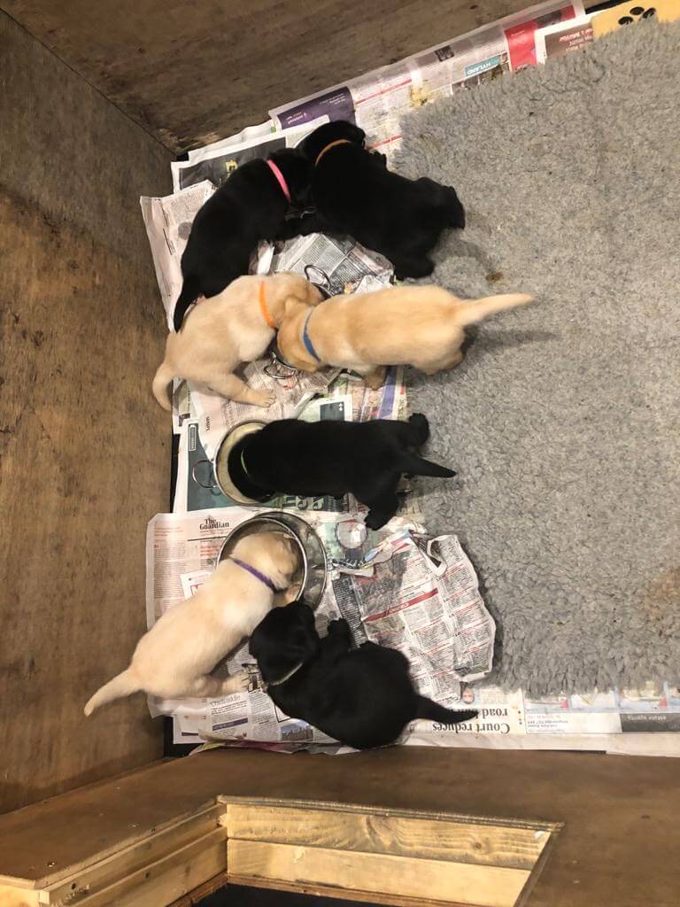 Tallin carries yellow coat colour gene as does Kariba thus the mix of black and yellow pups. (Tallin does not carry chocolate in the genes and nor does Kariba so the pups will not carry choc gene for future breeding considerations).